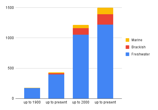 This bar graph, based on data from the United States Geological Survey, illustrates the cumulative number of aquatic species introduced into U.S. ecosystems over time, categorized by freshwater, brackish, and marine environments. The increasing trend demonstrates a significant rise in introductions, particularly in freshwater habitats, up to the present day.