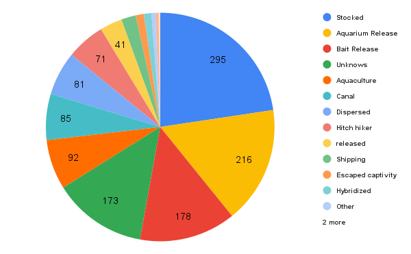 The figure indicates that intentional stocking is the primary method of fish introductions (22.6%), followed by aquarium releases (16.6%) and bait releases (13.7%).